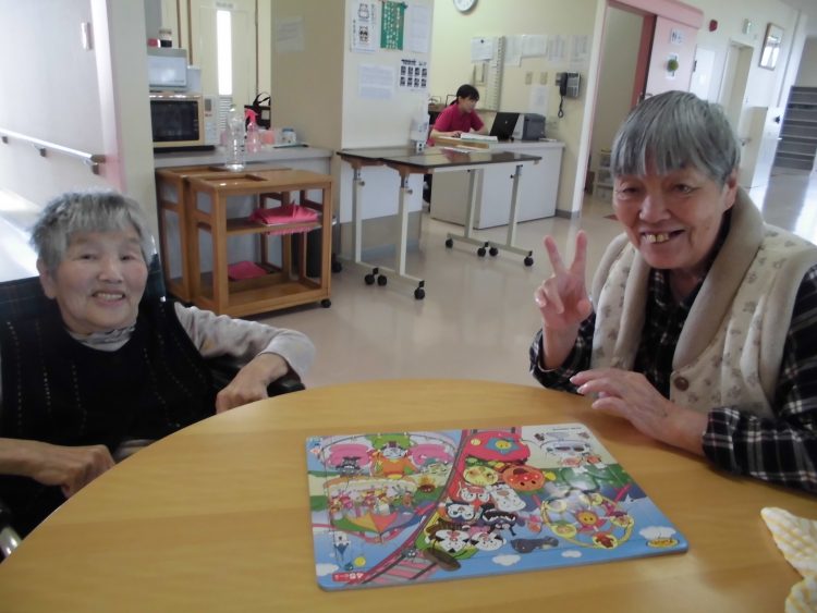 ただ今、N氏とA氏は水分補給後にパズルに挑戦しています。1個1個、手に取り空いている場所に入れています。「これ違うな」「ここだべが」と話しています。すっぽりと入ると「ここだったのが」と嬉しそうでした。N氏とA氏は、頑張っています。もう少しです。最後、に1個合わせ完成しました。
