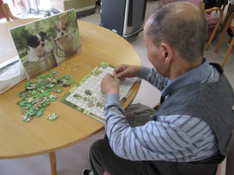 プリント問題が難しいお客様には、簡単なパズルや塗り絵を行い様々な色を使い鮮やかに完成させておりました。
