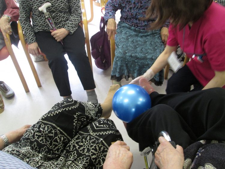 今日の筋力運動はボールを使った下肢筋力を鍛える運動です。足でボールを挟み隣の客様へ渡す運動を行いました。手を使って渡すのは簡単ですが、足を使うのはなかなか難しく・・・。皆様悪戦苦闘しながらようやく最後のお客様へ渡すことができました。