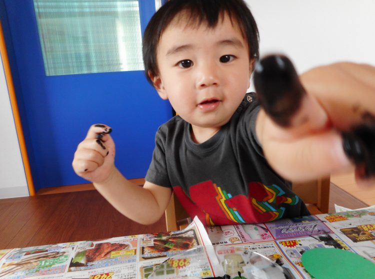 両手に絵の具をつけて「たーのし!」と