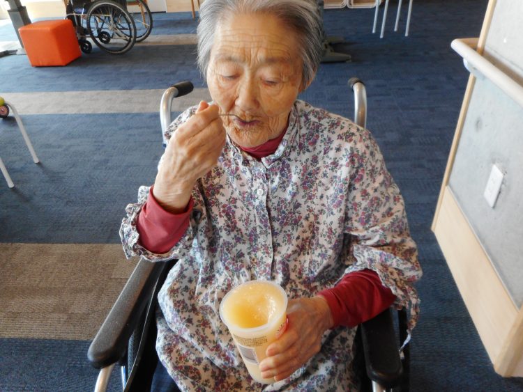 K様はお茶会で白桃ゼリーを美味しそうに召し上がっています。