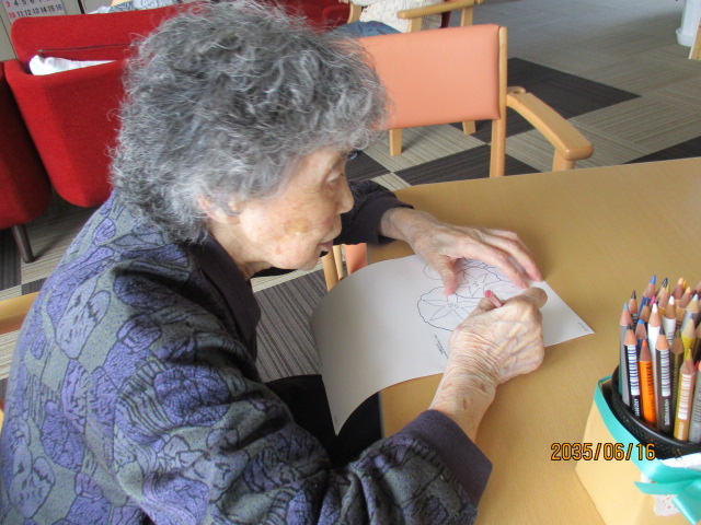 何でも積極的に参加され「塗り絵、昔は嫌いだったけどやってみたら楽しいの」と笑顔で話されておりました。