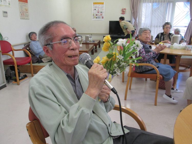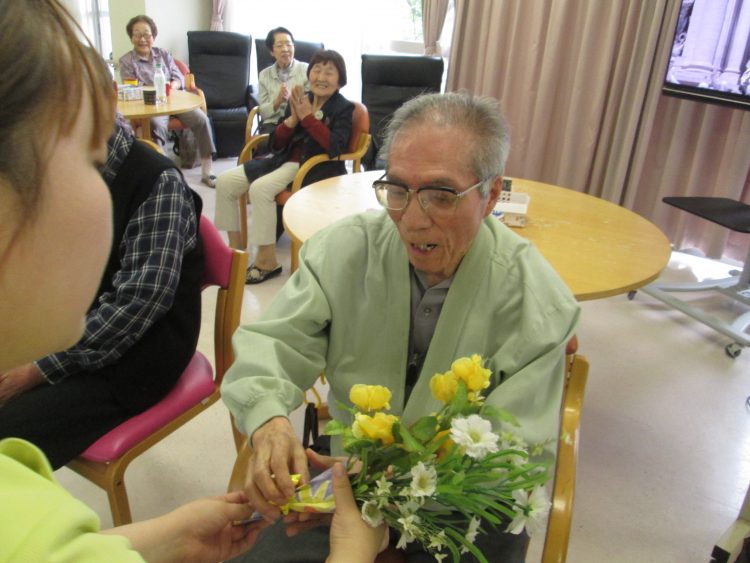 デイサービスでは職員からプレゼントと花束を渡しました。