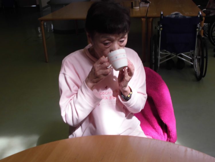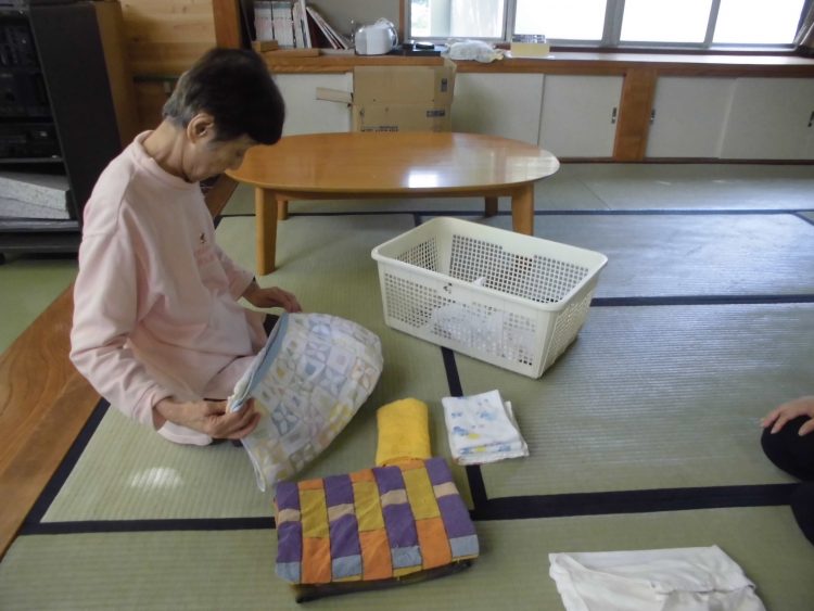 こちらではS様が、職員と洗濯物を畳んでいます。山ほどあった洗濯物も、2人で協力し合い、あっという間に畳み終えてしまいました。その後はお茶会に参加され、夕食まで一休みされていました。