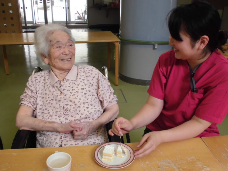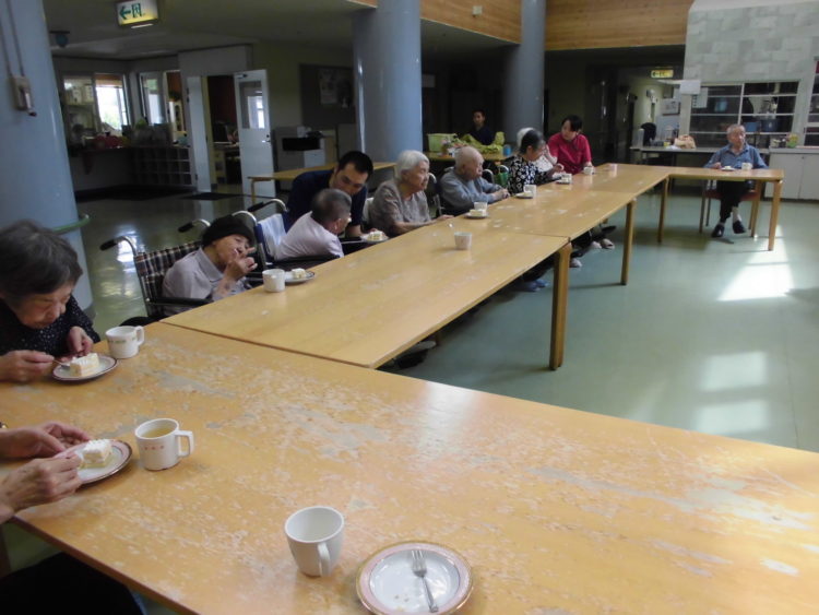 始めにバースデイソングを歌いました。その後、お誕生日を迎えられたお客様には職員よりバースデイカードが贈呈され、中には嬉しさのあまり涙を流すお客様もいらっしゃいました。