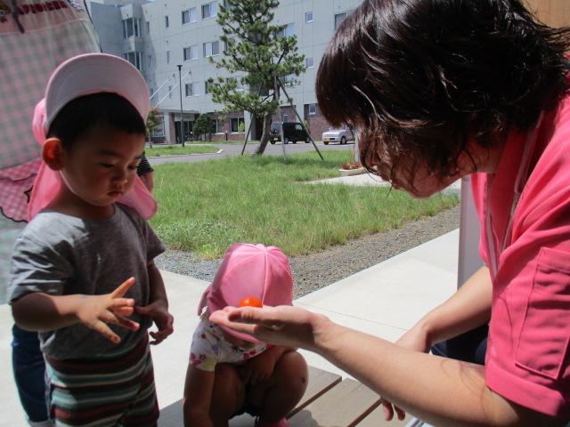 お隣の保育園から先生と一緒に「どうぞ^0^」と採れたての「ミニトマト・きゅうり」を持って来てくれました!!