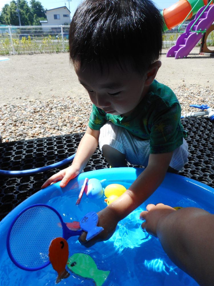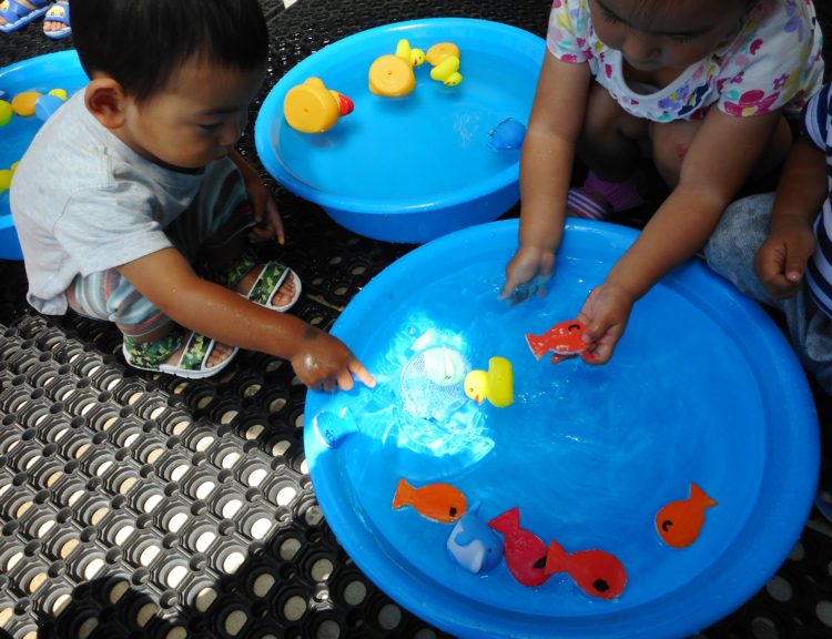 魚型に切った発泡トレイに色づけをしてお魚を作りましたよ。