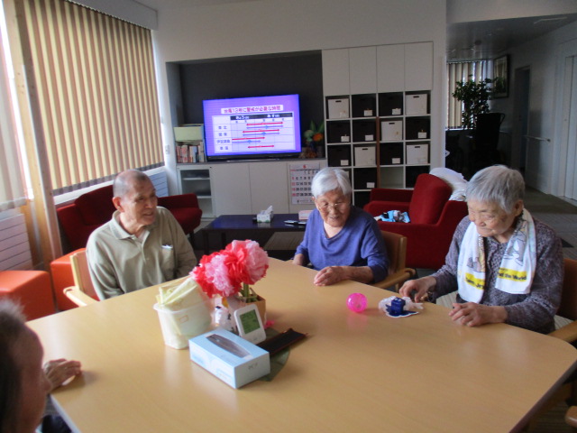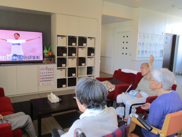 I様「暑くても、体を動かさねば!!」と、皆さん一緒に体操をしました♪歌を歌いながら、楽しく体を動かすのは良い事ですね^0^!無理のない様、楽しくまた皆さんと体操をしましょうね♪