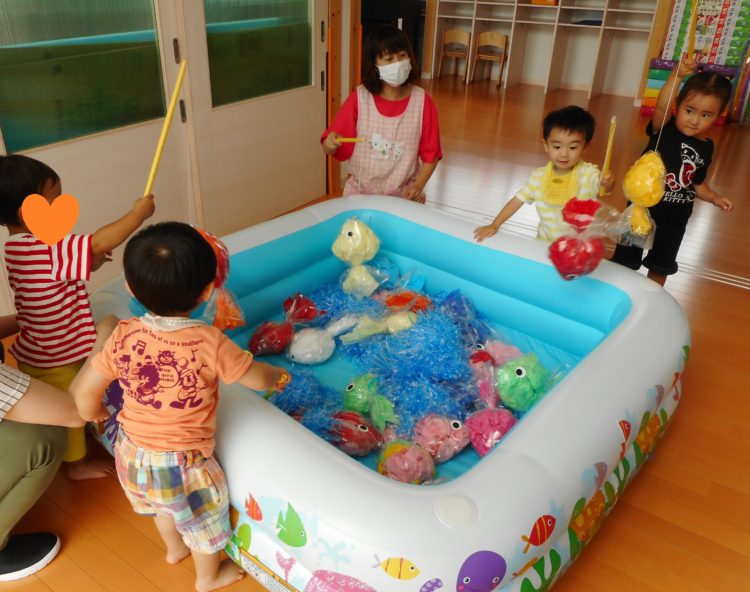 その後はたくさん作ったお魚をプールに放して魚釣り遊び!