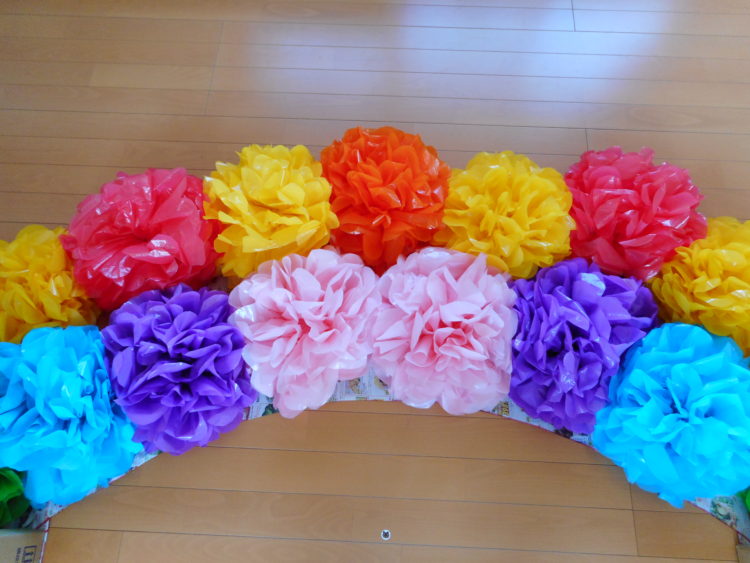 様々な色のポリ袋をリボンのような形にして、1枚ずつ開いていくと・・・
