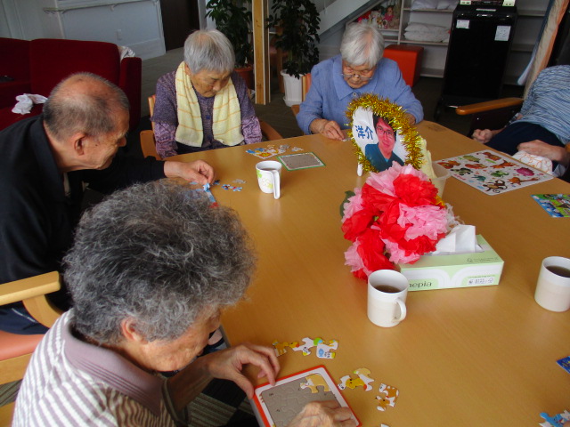 S様「わも手伝ってけるよ^0^」と話され「わいは~、お願いします^0^」と一緒に会話もしながら楽しく行っています。お互いに助け合いながら、時には昔の話をしながら盛り上がったパズルでした。また一緒にやりましょうね♪♪
