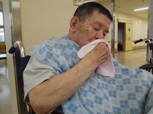 御自分で顔を拭き朝食の準備をするI様、もうすぐ朝食です。