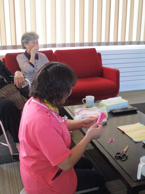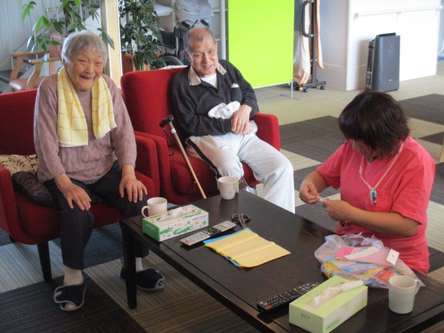 「話、面白くて^0^作るの見てるじゃ~」とY様。「職員の人が作った方がいい♪」とN様。職員、頑張って作っています!「花びらだば手伝う」とN様。「やれば面白いな^-^」と次第に皆様、参加され・・・