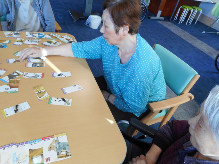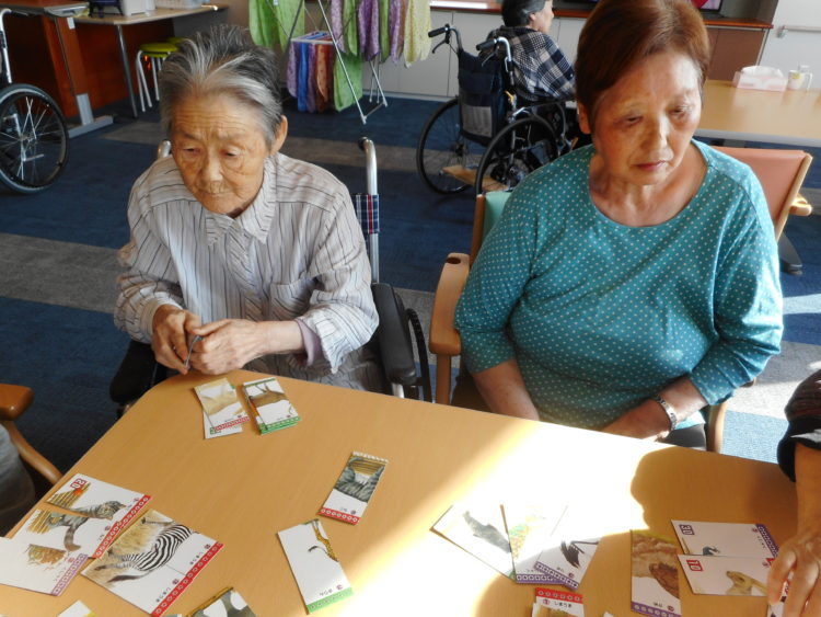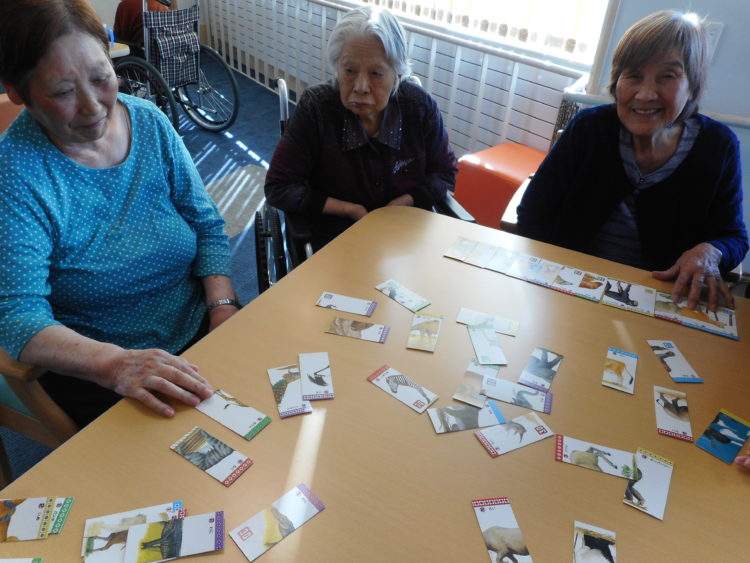 今日は動物の絵合わせをやってみました。普段あまり交流しないお客様同士ですが、協力しあってそれぞれの動物のパーツを探していきます。