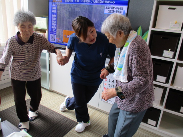 「あれ、足どうだって?難しいよ~」と言いながらも、みんなで体操しました。