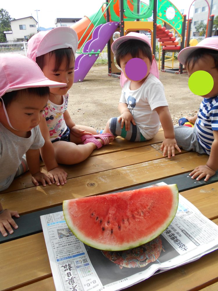 細かいルールは置いといて、子ども達は今日スイカ割りごっこしました♪