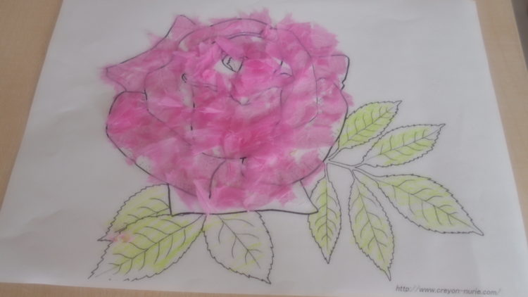 さて、写真はお客様が色紙をちぎってバラの絵に貼り付けているご様子です。