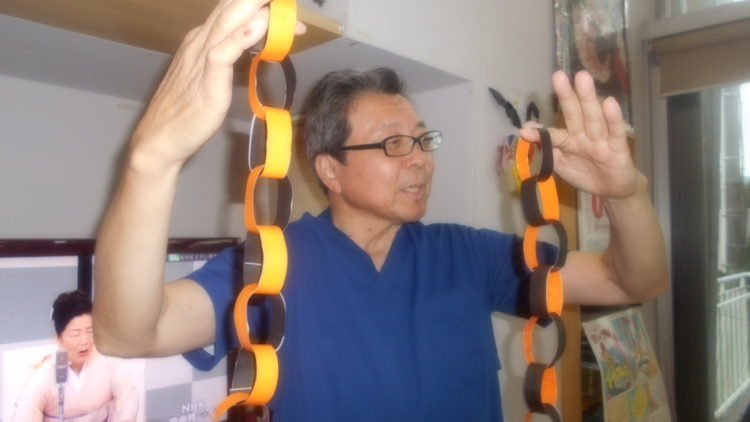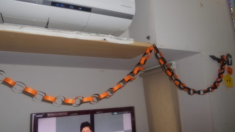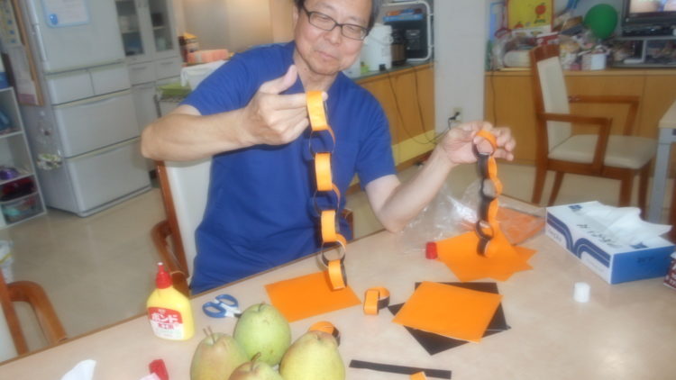 今日もホール内で皆さまとハロウィンパーティーの飾り作りが着々と進んでおります。