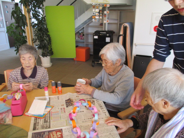 「カードばりだばな~」とI様。折り紙で、首飾りを作る事になりました♪皆さんと一緒に作ればどんどん早く出来上がります。