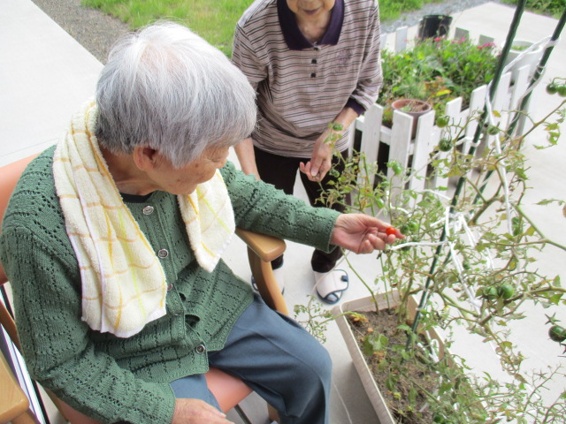 「ちゃんとおがってらがー?」と、赤くなっているミニトマトを