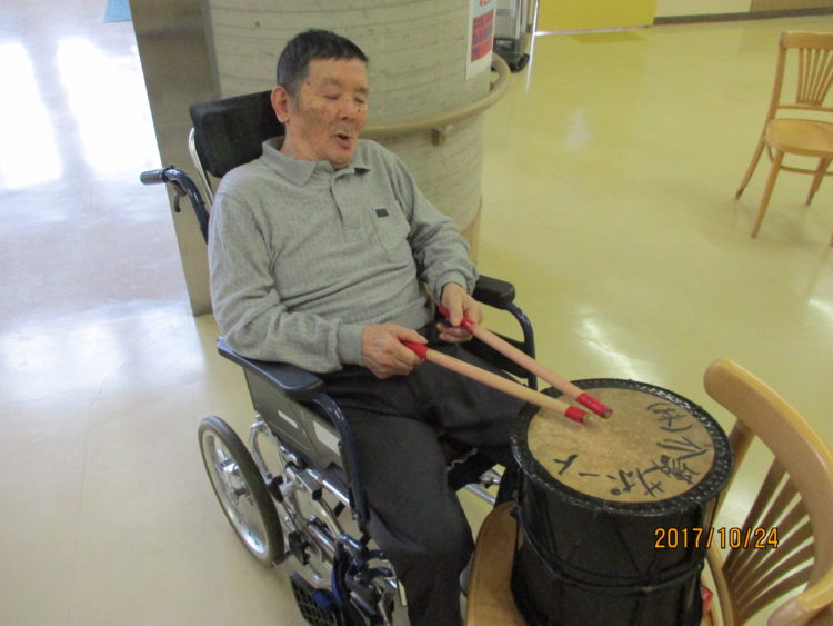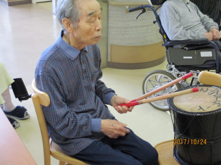 楽器を演奏することで、手の運動になり、機能訓練にもなっています。毎日続けることで、動きが悪かった手が少し動くようになったと、家族様からの声もありました。毎日続けていきましょうね。 ショートステイ(M:Y)