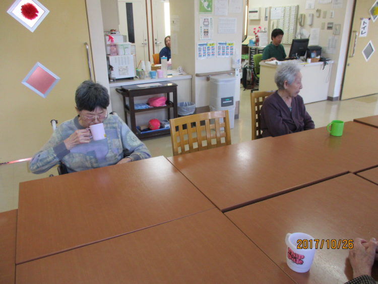 皆さんこんにちは。ショ-トステイでは朝食、昼食後に水分補給をしています。皆さんおいしそうに飲んでいます。寒くなっても水分補給は大事なので皆さんもこまめに水分補給して下さいね。 (ショ-トステイ E・H)