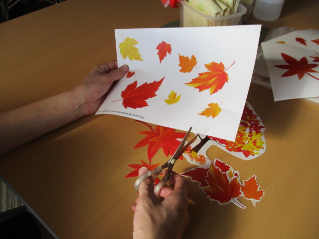 切り取った葉の絵を、一枚ずつ貼っていきます。(※木が小さい・・・)形や大きさ、色が様々ですが、「いい色っこだ~^0^」とS様。どんな「紅葉」になるのでしょうか?楽しみです♪♪完成したらお知らせしますね♪