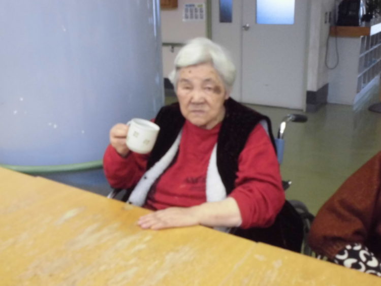 外の景色を見た後、コーヒーを飲んで一息つくK様。「雪が降ってきてこれから大変だなぁ」とつぶやくK様でした。