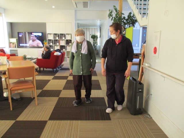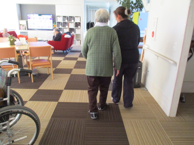 「どんだ?まっすぐ歩いてらが?」と笑顔で職員に聞いているY様。職員が側で見守りをしているので安心です。