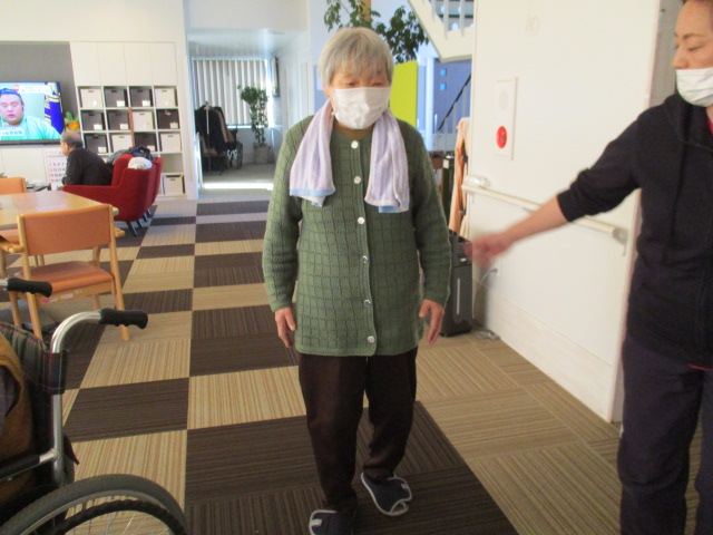 「無理しない様にしましょうね」と職員の話で「んだ、へばこれで今日は止めるな」と話され、その後はきちんと水分補給!「歩いたから美味いな♪」と飲まれていました。少しずつ無理なく行っていきましょうね♪