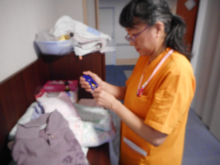 今日は業者洗濯を返却する様子を見て行きましょう。D介護士が業者へ出した洗濯物をお客様の部屋へ返却してます。返却するといってもただ戻すだけではありません。