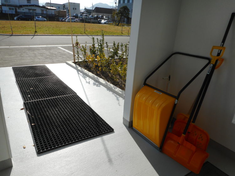 雪は降ると滑りやすい玄関先には転倒防止のためにマットをしきました。