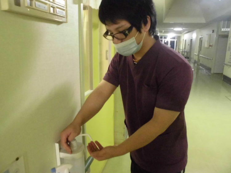 居室へ入退室する際に各居室前にあるハイエストで手指を消毒します。