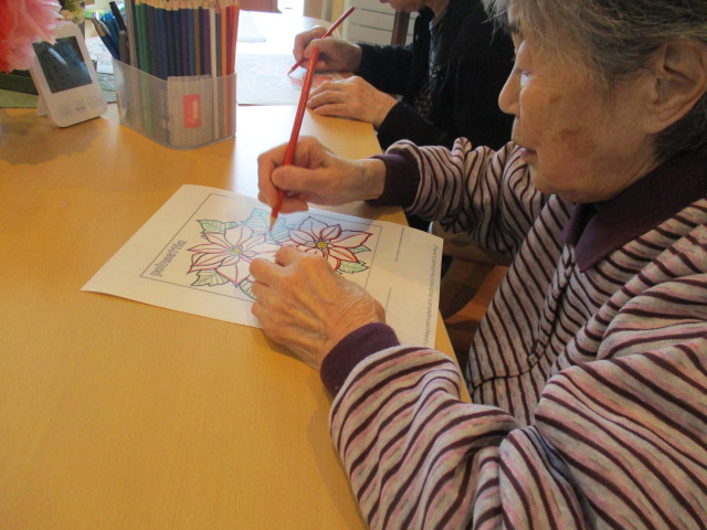 クリスマスが近くなりましたね☆職員と一緒に皆さんは、塗り絵をしています^-^!ポインセチアを塗り、出来上がったら飾ります♪