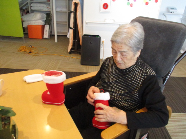 K様はサンタブーツを手に「これ何だ?」すると隣のS様が「その中にお菓子入って売ってるんだね~」「昔、孫が小さい時に買ってあげたら、しばらく家の中を履いて歩いてたんだって」と思い出を嬉しそうに語って下さいました。
