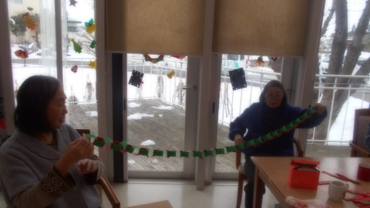 クリスマス会の輪飾りの作成は着々と進んでいます。いよいよ、輪にして繋いでいきます。