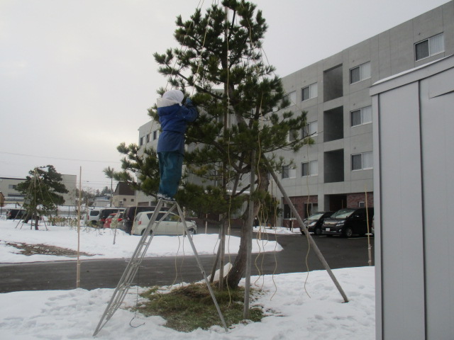 小規模前の「松」を雪囲いしておりました^-^!雪の上で脚立を使用していたので「気をつけて下さい」と声を掛けると笑顔で「はーい♪ありがとう」と話され丁寧に行っておりました。