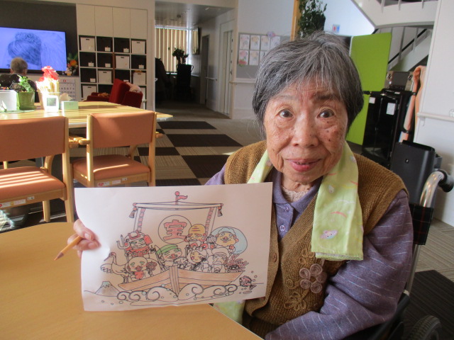 S様は得意の塗り絵で「七福神」を塗っておりました。「ちょっと細かいけど、これでいいの?」満足の笑顔です。