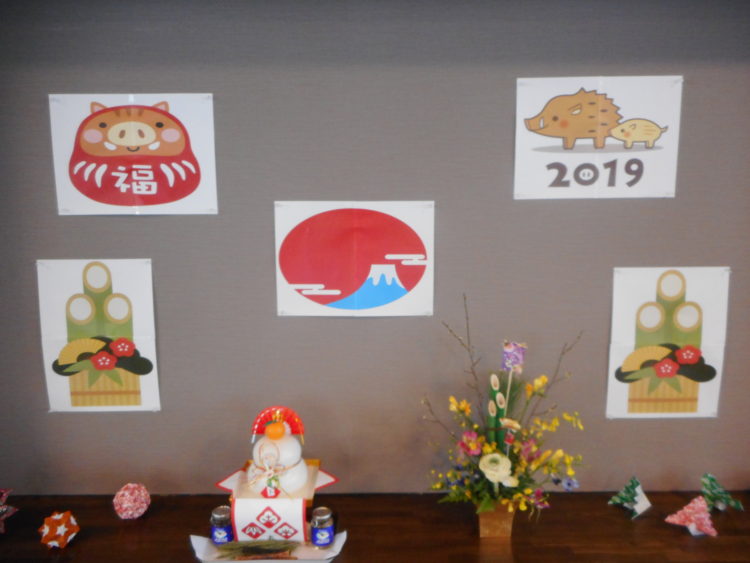 今度は1階広場に飾ってあるイラストにいました!周りの竹のイラストや、鏡餅等の飾りも相まって年が明け、2019年を迎えたなと改めて実感します。