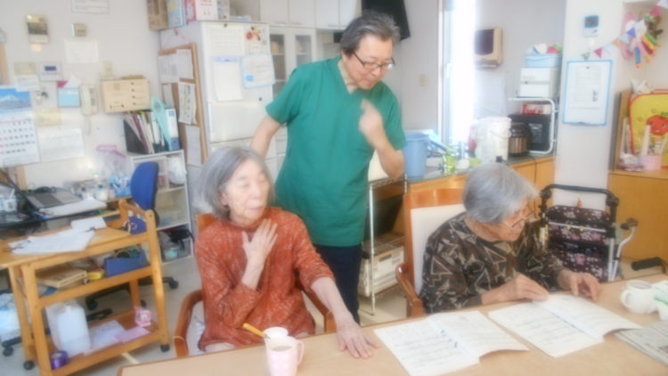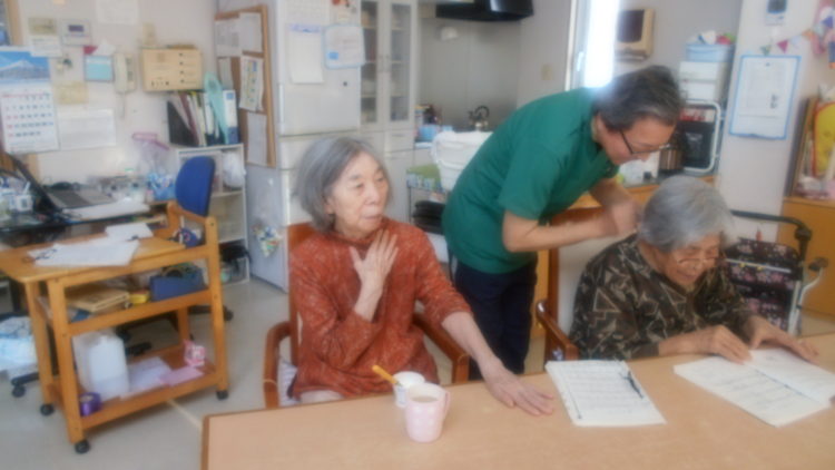 「肩たたき」の歌では、I管理者が、Y様の肩をたたいております。