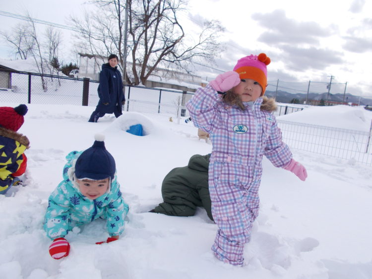 今日の日中の気温は7℃と暖かく過ごしやすい天候でしたね。保育園の子ども達もジャンプスーツに着替えて雪あそびをしてみました♪