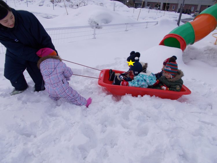うさぎ組の子ども達は園庭に積もった雪に大喜びで保育者と一緒に雪の上に寝転んだり大きなソリにみんなで乗って楽しみましたよ(^^)/