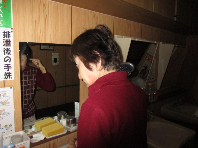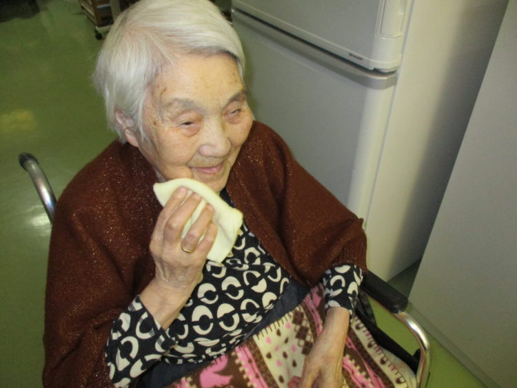 本日は朝の整容をしている所を撮らせていただきました。まず、朝起きると暖かいタオルで洗顔をしています。職員も手伝いながら、全員のお客様の顔を綺麗にしていきます。