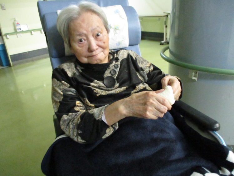 洗顔を終えたM様、笑顔で「さっぱりした!」と話されておりました。その後、朝食が来るまでテレビを視聴するのがM様の楽しみです。