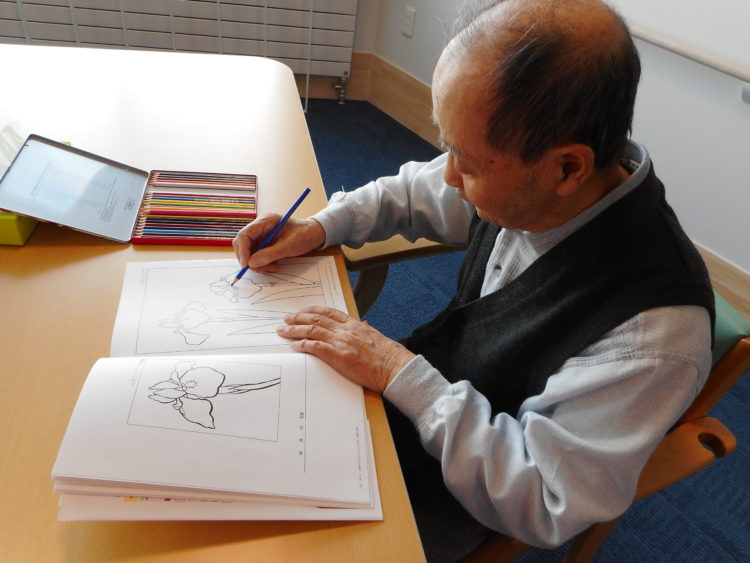 花菖蒲の塗り絵に色を考えてぬり始めたよ。仕上がりが楽しみ!みんなで布巾たたんでいます。手の運動にはもってこいですね。