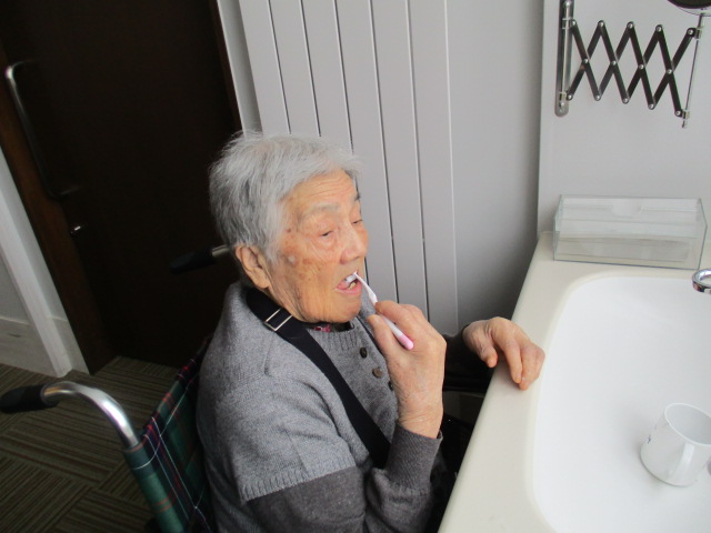 通い始めの頃は、介助で行っていた昼食後の口腔ケアも今では声掛けと見守りで行う事が出来る様になりました。義歯を外し洗浄してうがいやブラッシングも仕上げをお手伝いする程度で大丈夫になりました。K様は終わると「上手に出来ました」と必ず笑顔を見せて下さいます。もちろん「そうですね」と笑顔で返します。^-^