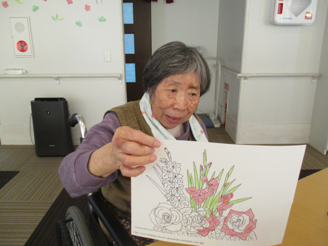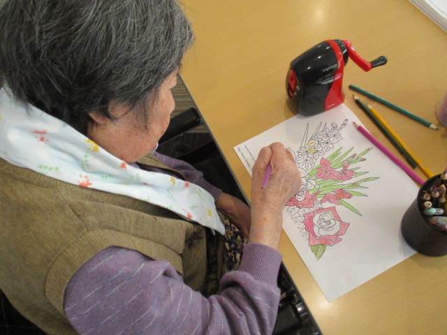 S様は「この花、何色にすればいいんだろう」「紫もいいし、黄色もいいよ」考えながら塗り絵を楽しまれておりました。