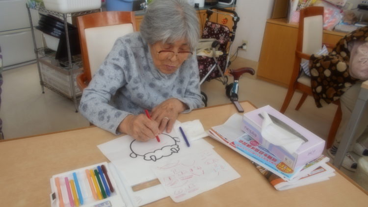 ベルフラワーではお客様に鬼の顔を書いていただき、塗り絵もできる