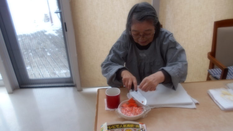 ニンジンや、ネギ、まいたけなどをカットしていただきます。
