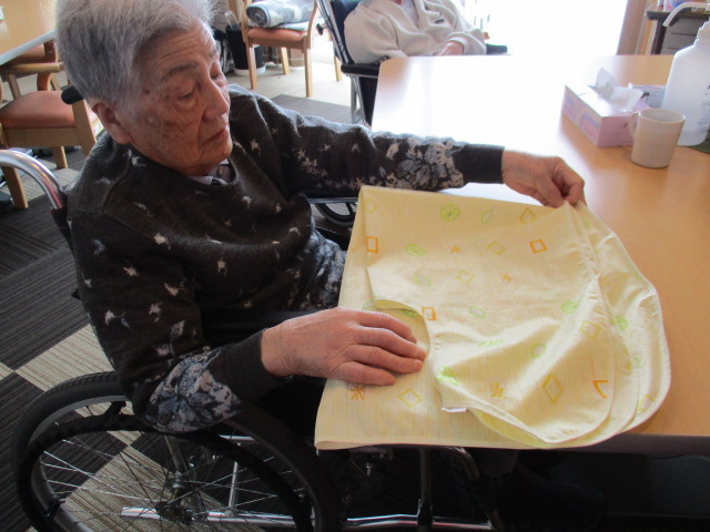 職員と一緒にエプロン畳みをしているK様。「こう折ればいいの?」と聞きながらされていました。